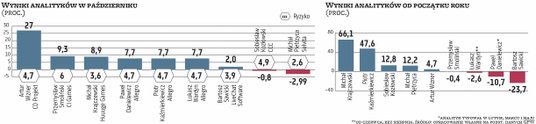 Na dwa miesiące przed zakończeniem roku najwyższą stopę zwrotu ma Michał Krajczewski z BM BNP Paribas – jest to przeszło 66 proc. zysku. Za nim plasuje się Piotr Kaźmierkiewicz z BM Pekao, którego wybory dały 48-proc. stopę zwrotu. Na miejscu trzecie przeskoczył Sobiesław Kozłowski z Noble Securities, a jego wynik to 13 proc. zysku po 10 miesiącach.