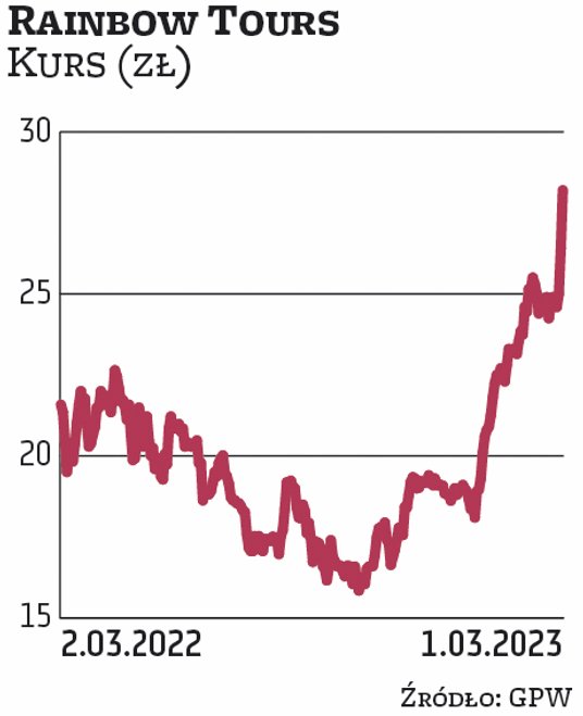 Akcje Rainbow Tours pod koniec sesji pierwszego dnia marca zwyżkowały o około 5 proc., do 27,6 zł. Luty z kolei zakończył się wzrostem o niemal 11 proc., a po pierwszym miesiącu tego roku spółka była blisko 26 proc. nad kreską. Przypomnijmy, że zeszły rok zakończył się około 14-proc. przeceną. Inwestorzy najwyraźniej oczekują, że dla organizatora wyjazdów turystycznych ten rok może być dobry. Wskazuje na to niedawno opublikowany raport. Jak podał Rainbow Tours, przedsprzedaż imprez turystycznych zaplanowanych na sezon letni (kwiecień–październik 2023 r.) do połowy lutego była wyższa o prawie 44 proc. rok do roku. Tymczasem, jak kilka miesięcy wcześniej zakładało BM Pekao, liczba sprzedanych przez Rainbow wycieczek miała w tym roku spaść o 4 proc. Dane Rainbow mogą jednak sugerować, że spółka odnotuje w tym roku wyraźny wzrost sprzedaży wycieczek w porównaniu z 2022 r., a co za tym idzie – także przychodów. „Pomimo stosunkowo niesprzyjającego otoczenia gospodarczego i słabszych danych o realnej konsumpcji, w tym momencie sektor i spółka notują bardzo dobre wyniki sprzedaży. Podsumowując, przy obecnych trendach i danych prawdopodobna jest rewizja w górę prognoz finansowych w najbliższych miesiącach” – wskazało BM Pekao w reakcji na raport Rainbow Tours. Dotychczas analitycy zakładali, że przychody touroperatora w tym roku miały sięgnąć 2065 mln zł w porównaniu z 2359 mln zł w zeszłym roku.