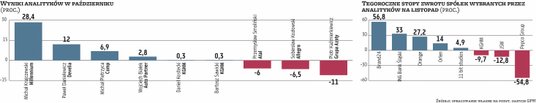 Październik wyrwał polski rynek akcji z objęć korekty. WIG finiszował ze zwyżką o 9,5 proc., natomiast WIG20 zyskał aż 12,5 proc. Do zwyżek głównych indeksów w dużym stopniu przyczyniły się banki, których w poprzednich miesiącach analitycy biorący udział w portfelu technicznym „Parkietu” raczej unikali. Ogółem nastawienie do spółek z WIG20, a szczególnie tych z udziałem Skarbu Państwa, było dość chłodne. Tym razem więc średni wynik portfela technicznego odstawał od benchmarku – stopa zwrotu w październiku sięgnęła 3,13 proc., przy czym na uwagę zasługują głównie dwie spółki – Bank Millennium oraz Develia. Na pierwszą ze spółek postawił Michał Krajczewski z BM BNP Paribas. Był to strzał w dziesiątkę, bo akcje banku zyskały ponad 28 proc. Bardzo udany miesiąc ma za sobą także deweloper, wskazany przez Pawła Danielewicza z BM Santandera, finiszujący z ponad 12-proc. zwyżką.