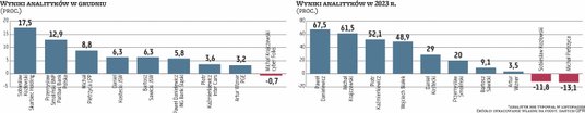 Ubiegły rok był wręcz wymarzony dla krajowego rynku akcji. Początkowo rosły w siłę mniejsze spółki, ale jesienią duże przedsiębiorstwa podkręciły obroty i zniwelowały dystans. Co ważne, był to rok historycznych rekordów WIG. Indeks szerokiego rynku ostatecznie zyskał 36,5 proc., a tylko w grudniu urósł o 5,65 proc. Końcówka 2023 r. była więc wyjątkowo sprzyjająca, i to zarówno jeśli chodzi o duże firmy, jak i małe czy średnie. Widać to po wynikach portfela technicznego, który w poprzednim miesiącu nacelowany był zarówno na blue chips, jak i spółki z szerokiego rynku. Średnia stopa zwrotu za grudzień przekroczyła 7 proc., więc był to rezultat nieco lepszy od szerokiego rynku. To z kolei zasługa głównie dwóch ekspertów, których zeszłomiesięczne propozycje dały aż dwucyfrowe stopy zwrotu. Najlepszy z ósemki wybranych do grudniowego portfela technicznego firm okazał się Skarbiec Holding, tj. właściciel towarzystwa funduszy inwestycyjnych. Kurs Skarbca w ostatnim miesiącu 2023 r. podskoczył o 17,5 proc. Autorem tej propozycji był Sobiesław Kozłowski z Noble Securities. Miejsce drugie w grudniowym rankingu zajął z kolei Przemysław Smoliński z BM PKO BP, który przed miesiącem postawił na BNP Paribas. Notowania tego banku zyskały blisko 13 proc.