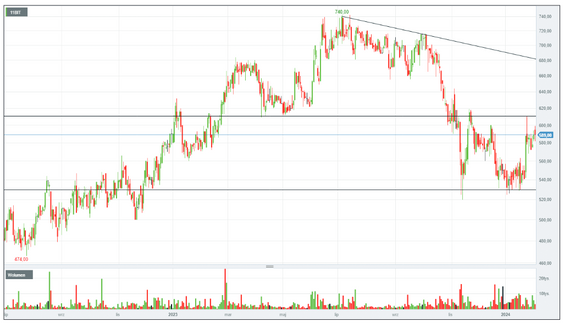 Losy przedstawicieli branży gier na GPW w minionych tygodniach układały się różnie, lecz 11 bit studios ze stopą zwrotu wynoszącą niemal 9 proc. należało do wąskiego grona liderów wzrostów w indeksie mWIG40. Notowania, ustanawiając lokalny dołek w okolicach 525 zł, podobnie jak w listopadzie zeszłego roku obroniły poziom 61,8 proc. zniesienia Fibonacciego trendu wzrostowego z lat 2021–2023. Po kilkutygodniowej stabilizacji kurs wystrzelił w kierunku kluczowej strefy oporu usytuowanej wokół bariery 600 zł. Notowania nie zdołały sforsować jej z marszu, ale wciąż jest ona zagrożona. Kurs producenta gier po raz pierwszy od października ub.r. wyszedł ponad 55-sesyjną średnią ruchomą oraz wybił się górą z regresyjnego kanału spadkowego, co powinno zwiększać prawdopodobieństwo kontynuacji zwyżki w kierunku 650 zł i przebiegającej w tych okolicach długoterminowej średniej kroczącej.