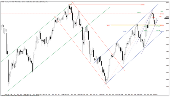 Sytuacja techniczna spółki Mo-Bruk wydaje się korzystna technicznie. Notowania od początku października do 27 grudnia 2023 r. znajdowały się w silnym impulsie wzrostowym. Przełom roku przyniósł dynamiczną korektę, niemniej główny trend w średnim terminie pozostaje wzrostowy. Podczas ostatniej sesji stycznia na wykresie pojawiała się formacja świecowa młota, co może sugerować wznowienie ruchu w górę. Ponadto cena utrzymuje się powyżej kluczowej strefy wsparcia 301–305 zł, wynikającej z wcześniejszych szczytów i dołków oraz średniej 100-okresowej z interwału dziennego, co wspiera scenariusz wzrostowy.