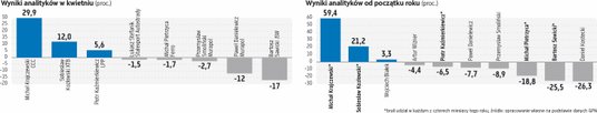 Krajowy rynek akcji ma za sobą trzeci z rzędu wzrostowy miesiąc. Dla WIG-u kwiecień był jak dotąd drugim najlepszym miesiącem, zakończonym zwyżką o 2,2 proc. Był to szczególnie udany okres dla indeksu dużych spółek, który urósł o 1,65 proc. Średni wynik portfela technicznego w kwietniu był zbliżony i sięgnął 1,5 proc. Wypadkowa z ośmiu propozycji sprzed miesiąca niewiele jednak mówi o wynikach poszczególnych analityków, a te były bardzo różne: od kilkunastoprocentowych strat po kilkudziesięcioprocentowe zyski. Najmocniejszą z wybranych przed miesiącem firm była CCC, na które postawił Michał Krajczewski z BM BNP Paribas. Kurs obuwniczego przedsiębiorstwa poprawił się o blisko 30 proc., a rezultat analityka po czterech miesiącach tego roku powiększył się do 59 proc. W kwietniu powody do zadowolenia miał także Sobiesław Kozłowski z Noble Securities, który postawił na brokera XTB. Kurs tej spółki zwyżkował o 12 proc., a łączny wynik analityka od początku roku przekroczył 21 proc., co jest drugim – po Krajczewskiego – osiągnięciem. Trzeci wynik w tym roku (3,25 proc.) należy do Wojciecha Białka z Oanda TMS Brokers, ale ten analityk wziął jedynie raz udział w typowaniu.