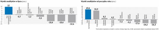 Po środowym posiedzeniu Fedu niemal pewne stało się, że we wrześniu dojdzie do cięcia stóp procentowych w USA, którego rynek wyczekuje już od dobrej połowy roku. Amerykański S&P 500 zanotował rewelacyjną ostatnią sesję lipca, dzięki czemu cały zeszły miesiąc zakończył nad kreską. Gorzej było z krajowymi indeksami. WIG20 finiszował z 5,5-proc. zniżką, natomiast indeks szerokiego rynku spadł o 4,8 proc. Dla obu był to pierwszy od stycznia miesiąc pod kreską. Sesja inaugurująca sierpień w wykonaniu europejskich indeksów – przynajmniej przez większość czasu – pozostawiła sporo do życzenia. WIG20 niestety także nie brylował i przed południem tracił nawet 1 proc. Temat stóp procentowych pozostaje jednym z głównych także w Europie. W czwartek – dla sporej części rynku nieoczekiwanie – Bank Anglii obniżył stopy procentowe. Cięcie sięgnęło 25 pkt baz. po roku utrzymywania kosztu pieniądza na najwyższym od 2008 r. poziomie 5,25 proc. Co ciekawe, wniosek za obniżką uzyskał najmniejszą możliwą większość – pięć na dziewięć głosów. Jak na razie europejskie indeksy, w tym m.in. francuski CAC 40, pozostający jako jedyny z głównych pod kreską od początku roku, raczej uklepują dna wyrysowane w poprzednich dniach, aniżeli nowe dołki. To w połączeniu z mocnym zachowaniem Wall Street może być punktem zwrotnym, ale jak na razie korekta trwa. Niestety, widać to w wynikach ekspertów analizy technicznej, typujących spółki w ramach portfela technicznego „Parkietu”. Większość z nich w lipcu poniosła straty, choć przeciętna stopa zwrotu była o 0,5 pkt proc. wyższa od dokonań WIG-u w porównywalnym okresie. Na wyróżnienie zasłużył Piotr Kaźmierkiewicz z BM Pekao. Przełom lipca i sierpnia może stać się ważnym punktem dla rynków po obu stronach oceanu. Krajowy WIG20 dość mocno odczuł pogorszenie nastawienia do akcji i jednocześnie zwyżki obligacji skarbowych. Dorobek indeksu polskich dużych spółek skurczył się do ledwie 3 proc., co ustawia go w gronie tegorocznych słabeuszy, m.in. wraz z Hang Seng. Przypomnijmy jednak, że w podobnych rejonach, czyli między 2380 a 2400 pkt, WIG20 bronił się także w pierwszej połowie czerwca, a następnie wyprowadził kontrę do niemal 2580 pkt. W ten sposób nie dotarł nawet do tegorocznych szczytów, ale ruch ten mógł być zaczątkiem dla szerokiego kanału spadkowego. W tym kontekście nieco głębszy niż w czerwcu dołek jest już bardziej zrozumiały.