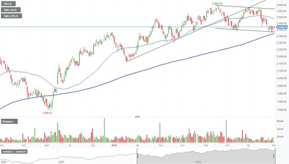 Przemysław Smoliński z BM PKO BP również radzi teraz bacznie obserwować zachowanie indeksu dużych spółek. – Po kilku tygodniach spadków WIG20 testuje dolne ograniczenie kilkumiesięcznej konsolidacji. Najbliższe sesje pokażą, czy odbije się od niego, podążając w kierunku szczytu z drugiej połowy maja, czy też przeważy podaż i wsparcie zostanie przełamane – mówi. – Otworzyłoby to drogę dla dalszych spadków do dolnego ograniczenia długoterminowego kanału wzrostowego, przebiegającego obecnie nieco poniżej 2250 pkt – twierdzi Smoliński. On również zwraca uwagę na zależność od Wall Street. – Z pewnością pewien wpływ na zachowanie rodzimego rynku będzie mieć dalszy rozwój sytuacji na giełdach za oceanem, które po wcześniejszych, korekcyjnych spadkach, ruszyły ostatnio w górę – podkreśla analityk BM PKO BP.