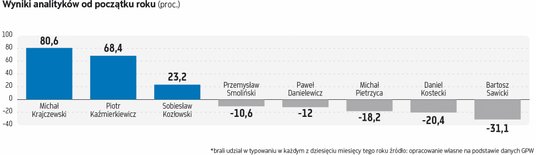 Po dziesięciu miesiącach tej edycji portfela technicznego „Parkietu” najwyższą stopą zwrotu może pochwalić się Michał Krajczewski z BM BNP Paribas, który wypracował w tym czasie 80,6 proc. Na miejscu drugim plasuje się Piotr Kaźmierkiewicz z BM Pekao z 61,2-proc. stopą zwrotu, 23,2 proc. zaś zysku dało Sobiesławowi Kozłowskiemu z Noble Securities miejsce trzecie.
