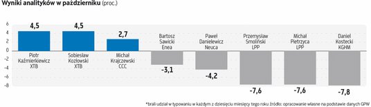 Pogorszenie kondycji krajowego rynku w ostatnich miesiącach odbija się na wynikach portfela technicznego „Parkietu”, choć średnia stopa zwrotu analityków w październiku była o 1,7 pkt proc. wyższa od osiągnięć indeksu szerokiego rynku. W ubiegłomiesięcznym zestawie spółek najbardziej błyszczało XTB, na które wówczas wskazało dwóch analityków. Wsparciem było też CCC. Największym rozczarowaniem zaś były akcje KGHM oraz LPP. Tę drugą firmę również wybrało przed miesiącem dwóch ekspertów analizy technicznej.