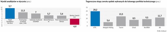 Krajowi inwestorzy w nowy rok wchodzili raczej w kiepskich nastrojach, będąc po czterech miesiącach obserwowania słabości polskiego rynku na tle zagranicznych parkietów. Ale w nowy rok GPW weszła odmieniona z dużymi spółkami w roli liderów. Tego typu przedsiębiorstw co prawda zabrakło w styczniowym składzie portfela technicznego, ale i tak było ciekawie. Najwyższą stopę zwrotu w pierwszym miesiącu roku uzyskał Paweł Danielewicz z BM Santander, który postawił na Mo-Bruk i w ten sposób zaczął rok z blisko 12-proc. zyskiem.