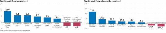 Wielu inwestorów pewnie ma już ochotę na realizację zysków z banków, zaś inni zapewne czekają jeszcze na sute, tegoroczne dywidendy. Banków w ubiegłym miesiącu już jednak nie było w portfelu technicznym „Parkietu”. Indeks WIG20 z kolei reprezentowały jedynie Pepco Group oraz Orlen. Pierwsza ze wspomnianych spółek przyniosła analitykowi blisko 5-proc. stratę, ale petrochemiczny gigant zyskał 6,5 proc. Najmocniej jednak z wybranych spółek wypadała Toya, na którą postawił Sobiesław Kozłowski z Noble Securities. Wynik wspomnianej firmy w okresie trwania majowego portfela technicznego to blisko 15 proc., co powiększa wynik Kozłowskiego do 73 proc. od początku tego roku.