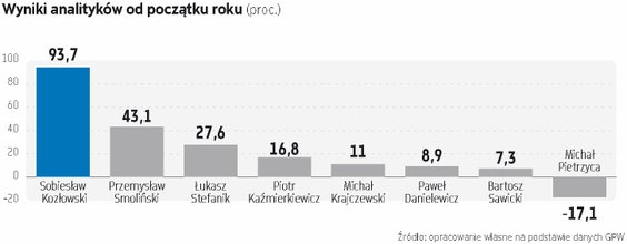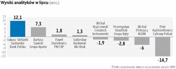 Główną siłą GPW pozostają banki i tak też było w lipcu, kiedy indeks tej grupy firm zyskał 8,92 proc. Banków przez kilka miesięcy próżno było szukać wśród spółek typowanych przez analityków, ale przed miesiącem na jedną z takich spółek zdecydował się Łukasz Stefanik z XTB. Efekt jest co najmniej dobry, bo zwyżka Santandera sięgnęła 12,1 proc., i był to najlepszy wynik lipcowego portfela technicznego polskich spółek. Drugi w kolejności wynik należy do Bartosza Sawickiego z Exante. Sawicki postawił na grupę Apator, która dała mu 7,3 proc.