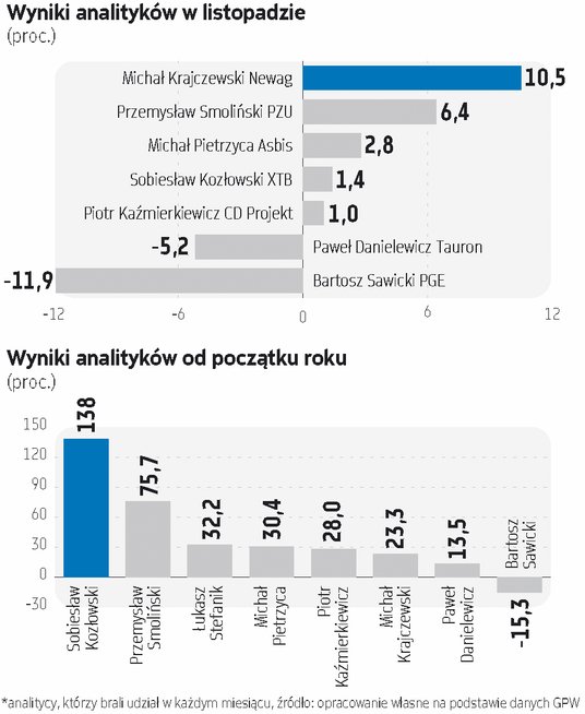 Przed nami ostatni miesiąc roku, który jak dotąd jest zdecydowanie lepszy dla polskiej giełdy niż można było spodziewać się np. 12 miesięcy temu. Po 11 miesiącach tego roku i zarazem obecnego cyklu portfela technicznego polskich spółek średnia stopa zwrotu analityków to prawie 41 proc., czyli niemal dokładnie tyle, ile wypracował WIG. Z tej perspektywy pewnie trudno mówić o spektakularnym sukcesie, ale warto pamiętać, że na hossę nad Wisłą wciąż sporo spółek się jeszcze nie załapało, a główny napęd trendowi wzrostowemu nadawały banki. Przykładem firmy pozostającej w tym roku z tyłu może być Rainbow Tours, na którego w grudniu postawiło dwóch analityków. Dwa głosy mamy także na CD Projekt, zachowujący się podobnie do benchmarku.