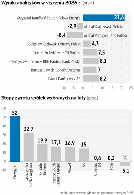 Na koniec stycznia nastroje na rynkach całkowicie się zmieniły, ale ogółem był to bardzo udany miesiąc dla inwestorów tak na świecie, jak i w Polsce. Z perspektywy globalnej warto jeszcze zwrócić uwagę na bardzo dobre zachowanie rynków wschodzących i towarzyszące mu osłabienie dolara. Na GPW – zgodnie z prognozami – mocniejsze były średnie i małe spółki, natomiast zyskiwał oczywiście cały rynek, co owocowało rekordami hossy głównych indeksów, nieraz uplasowanymi nawet wyżej od optymistycznych prognoz na cały 2026 r.