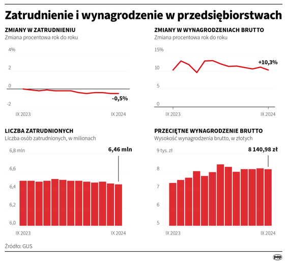 8140,98 zł brutto – tyle wyniosło przeciętne miesięczne wynagrodzenie w sektorze przedsiębiorstw we wrześniu 2024 r., według poniedziałkowych danych GUS. To oznacza wzrost o 10,3 proc. rok do roku. To z kolei dość wyraźnie mniej niż wyniósł konsensus prognoz ekonomistów według ankiety „Rzeczpospolitej” i „Parkietu”: 11,1 proc. Roczna dynamika wynagrodzeń spadła względem sierpnia, gdy wyniosła 11,1 proc. Wrześniowy wzrost o 10,3 proc. rdr jest też najniższy od grudnia 2023 r.