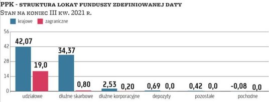 Z danych, które na naszą prośbę zebrała Komisja Nadzoru Finansowego, wynika, że na koniec III kwartału 2021 r. 61,1 proc. oszczędności, które trafiły do pracowniczych planów kapitałowych, ulokowanych zostało w instrumentach udziałowych, przede wszystkim w akcjach. Kolejne 35,2 proc. przeznaczono na instrumenty dłużne skarbowe, przede wszystkim obligacje, a 2,7 proc. na dłużne korporacyjne. Równo 20 proc. aktywów PPK zainwestowano za granicą, głównie w akcje.