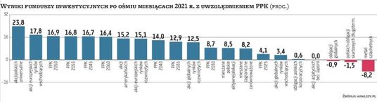 Do funduszy PPK trafiło od początku roku około 2,8 mld zł wpłat netto, z kolei aktywa wzrosły z 2,82 mld zł do 6,31 mld zł. „Nadwyżka" to oczywiście efekt zarządzania. Fundusze PPK obrastają w piórka, choć część z nich nadal ma znikome aktywa, a zatem z oceną stóp zwrotu w tych przypadkach lepiej poczekać. W tym roku, podobnie z resztą jak w poprzednim, gdy wiele PPK dopiero startowało, warunki rynkowe bardzo sprzyjają. Oczywiście każda z poszczególnych grup funduszy zdefiniowanej daty średnio przyniosła zysk, natomiast portfele najmocniej nastawione na rynki akcji przeciętnie zarobiły wysokie kilkanaście procent od stycznia. Garstka funduszy z pozostałej oferty TFI może się pochwalić lepszymi wynikami. W osiąganiu pozytywnych stóp zwrotu pomagają regularne zakupy, pozwalające uśredniać cenę aktywów. oraz niskie opłaty za zarządzanie.