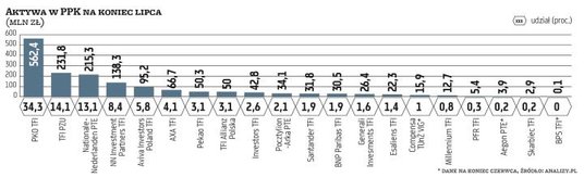 Dla części instytucji prowadzących PPK będzie to być albo nie być. Przypomnijmy, że przed około rokiem wiele z nich przyznawało, że 5-proc. udział w rynku to minimum, aby utrzymywać PPK w ofercie. Na razie takim wynikiem może się pochwalić tylko pięć firm. Największym graczem od początku pozostaje PKO TFI, które ma ponad 34 proc. wszystkich aktywów w PPK – wynika z danych serwisu analizy.pl. Kolejne jest TFI PZU, które ma 14-proc. udział w rynku, a za nim z wynikiem o 1 pkt proc. mniejszym Nationale-Nederlanden PTE. Z drugiej strony warto pamiętać, że część instytucji prowadzących PPK od początku sygnalizowała, że będzie skupiać się na mniejszych firmach.