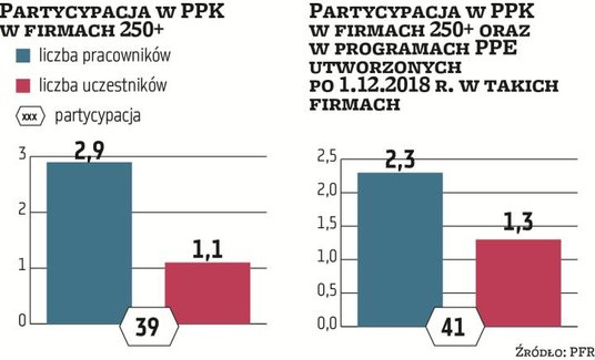 Okazuje się, że w pierwszym etapie, który objął największe firmy, zatrudniające co najmniej 250 pracowników, do PPK przystąpiło łącznie 1,1 mln osób na 2,9 mln do tego uprawnionych. Tym samym zdecydowało się na to 39 proc. pracowników. PPK ruszyły w 3864 firmach. Ale start programu zachęcił część firm do uruchomienia pracowniczych programów emerytalnych. Firma, która ma u siebie PPE, nie musi mieć PPK. I jak się okazuje, PPE po ogłoszeniu PPK uruchomiło 209 firm zatrudniających co najmniej 250 pracowników. – Zapisało się do nich ok. 150 tys. pracowników i jeśli ich także uwzględnimy w grupie osób, które zaczęły dodatkowo oszczędzać w związku z uruchomieniem PPK, to daje nam to partycypację na poziomie 41 proc. Czyli 1,3 mln Polaków zdecydowało się dodatkowo odkładać na jesień życia w wyniku wejścia w życie ustawy o PPK – mówił Paweł Borys. Zdaniem PFR, jeśli tę liczbę zestawimy z danymi na temat tego, ile osób udało się przez lata zachęcić do oszczędzania w dotychczasowych programach, czyli w PPE, IKE i IKZE, gdzie łącznie aktywnie zasila swoje konta 900 tys. osób, to możemy mówić o dużym sukcesie. Bo program PPK ruszył pół roku temu i na razie objął niewielką część firm.