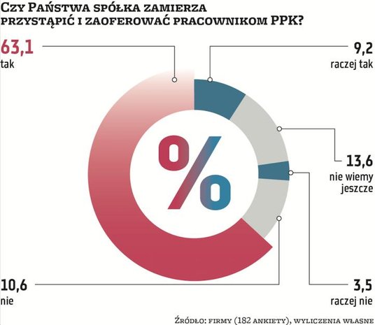 Prawo nakłada na większość firm obowiązek przystąpienia do PPK, w związku z tym na pytanie: „Czy państwa spółka zamierza przystąpić i zaoferować pracownikom pracownicze plany kapitałowe?", 63,1 proc. firm odpowiedziało pozytywnie. Od obowiązku utworzenia PPK przewidziane są nieliczne wyjątki. Programu nie musi więc wprowadzać mikroprzedsiębiorca, czyli firma, która zatrudnia mniej niż dziesięć osób, jeśli wszyscy ci pracownicy złożą deklarację rezygnacji z wpłat na PPK. Punkt ten raczej nie dotyczy firm notowanych na rynku głównym GPW. Drugi wyjątek stanowią pracodawcy, którzy w dniu objęcia ich przepisami ustawy będą posiadali funkcjonujący pracowniczy program emerytalny ze składkami na poziomie minimum 3,5 proc. pensji pracownika, jeśli uczestniczy w nim co najmniej 25 proc. załogi.