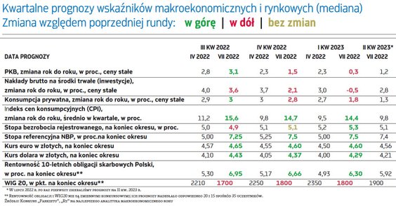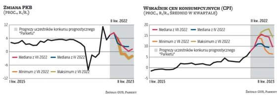 Mimo tych komplikacji nie ulega wątpliwości, że perspektywy polskiej gospodarki w ostatnich miesiącach wyraźnie się pogorszyły. Na początku kwietnia ekonomiści przeciętnie prognozowali, że w okresie od połowy br. do końca I kwartału 2023 r., PKB Polski będzie rósł w tempie 2,5 proc. rok do roku. Obecnie oczekują, że w tym samym okresie wzrost wyniesie około 1,6 proc W prognozach pojawił się m.in. spadek PKB rok do roku w pierwszych miesiącach 2023 r. A wydaje się, że uczestnicy naszej rywalizacji nie uwzględnili w swoich scenariuszach recesji w strefie euro, która z każdym dniem staje się coraz bardziej prawdopodobna.