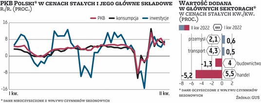 O ile dane w ujęciu rok do roku malują zbyt optymistyczny obraz gospodarki, o tyle te w ujęciu kwartał do kwartału dają obraz zbyt pesymistyczny. – Lusterko wsteczne na razie pokazuje gospodarkę wciąż rozpędzoną. Co więcej, zachowanie eksportu netto i zapasów sugeruje wręcz jej przegrzanie – popyt konsumpcyjny i inwestycyjny nie mógł być zaspokojony przez krajowe zdolności wytwórcze – ocenia Piotr Bartkiewicz, ekonomista z Pekao. Odnosi się do tego, że na dynamikę PKB największy wpływ w ostatnich kwartałach miały zmiany zapasów w firmach. Ich kumulacja – spowodowana m.in. zaburzeniami w łańcuchach dostaw oraz bardzo szybkim wzrostem cen materiałów – w I kwartale dodała do rocznego wzrostu PKB aż 7,7 pkt proc. W II kwartale firmy już zapasy zmniejszały (w stosunku do poprzedniego kwartału, bo rok do roku wciąż je zwiększały), przez co ten czynnik dodał do rocznego tempa wzrostu PKB tylko 1,9 pkt proc. To w dużej mierze tłumaczy spowolnienie.