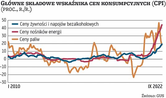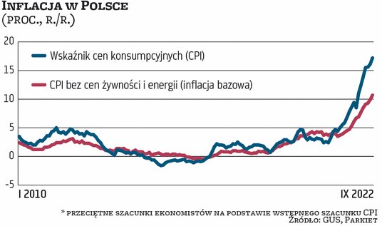 W sierpniu wskaźnik cen konsumpcyjnych (CPI), główna miara inflacji w Polsce, wzrósł o 16,1 proc. rok do roku, wyraźnie bardziej niż oczekiwali wtedy ekonomiści. Ta niespodzianka miała wpływ na oczekiwania co do inflacji we wrześniu. Ankietowani przez „Parkiet” analitycy przeciętnie szacowali, że wzrost CPI przyspieszył do 16,5 proc. rok do roku. Najwięksi pesymiści liczyli się z wynikiem na poziomie 17 proc. Jak jednak wynika z wstępnego szacunku GUS, opublikowanego w piątek, faktycznie inflacja sięgnęła aż 17,2 proc. rok do roku. Co więcej, w stosunku do sierpnia CPI wzrósł o 1,6 proc. To jego największa miesięczna zwyżka od maja, co sugeruje, że inflacja przestała wytracać impet. A biorąc pod uwagę tylko wrześnie, tak dużego wzrostu CPI nie było od 1996 r.