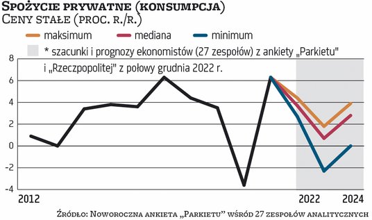 W rzeczywistości nawet pesymiści nie oczekują drastycznego pogorszenia koniunktury w polskiej gospodarce w stosunku do ostatnich miesięcy 2022 r. – Fakt, że w całym 2023 r. wzrost wyniesie według naszych prognoz zaledwie 0,6 proc. rok do roku, to efekt bardzo niskiego punktu startowego w I kwartale, podobnie jak wysoka dynamika PKB w 2022 r. była efektem wysokiego punktu startowego. Innymi słowy, roczne dynamiki – zresztą nie pierwszy raz – zaburzają obraz – tłumaczy Piotr Kalisz, główny ekonomista Citi Handlowego. Odnosi się do tego, że w I kwartale mijającego roku PKB po oczyszczeniu z wpływu czynników sezonowych był aż o 4,3 proc. większy niż w IV kwartale 2020 r. To miało bardzo silny pozytywny wpływ na zwyżki PKB w ujęciu rok do roku w kolejnych kwartałach (to tzw. efekt przeniesienia). W I kwartale 2023 r. z dużym prawdopodobieństwem PKB będzie mniejszy niż w ostatnim kwartale br., co wpłynie ujemnie na zmiany PKB rok do roku. – W 2022 r. efekt przeniesienia dodał do dynamiki PKB ponad 3 pkt proc., a w 2023 r. odejmie 1–1,5 pkt proc. Można więc powiedzieć, że wzrost PKB o 5 proc. w 2022 r. jest równy wzrostowi o 0,5 proc. w 2023 r. – wyliczał podczas noworocznej debaty „Parkietu” Piotr Bujak, główny ekonomista PKO BP.