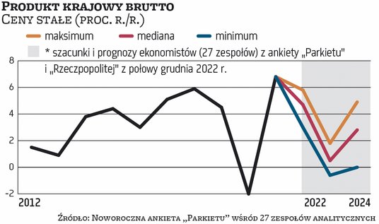 Produkt krajowy brutto Polski, szeroka miara aktywności w gospodarce, zwiększy się w 2023 r. realnie o zaledwie 0,5 proc. Takie są, średnio rzecz biorąc, prognozy 27 ankietowanych przez „Parkiet” zespołów analitycznych i indywidualnych ekonomistów. Jak co roku różnice w scenariuszach makroekonomicznych są spore, co odzwierciedla wysoki poziom niepewności. Pomijając skrajne prognozy, pesymiści oczekują, że PKB może w nadchodzącym roku zmaleć o 0,5 proc., optymiści oczekują zaś zwyżki o 1,5 proc. Ale niezależnie od tego, który z tych scenariuszy się zrealizuje, 2023 r. zapowiada się jako jeden z najmniej udanych dla polskiej gospodarki od 1995 r. Od tego czasu bowiem Polska tylko raz, w naznaczonym pandemią koronawirusa 2020 r., doświadczyła spadku PKB. Najmniejszą jak dotąd zwyżkę tego wskaźnika, o 0,9 proc., GUS odnotował z kolei w 2012 r. Co więcej, wyjątkowo ostre jest prognozowane przez ekonomistów na 2023 r. hamowanie gospodarki. W minionym roku aktywność w polskiej gospodarce zwiększyła się bowiem, według obecnych szacunków, o 4,7 proc.