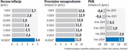 Już w środę GUS wstępnie ogłosi o ile w lipcu wzrosły ceny towarów i usług konsumpcyjnych w porównaniu z lipcem 2023 r. Zdaniem 20 zespołów ekonomistów, który wzięły udział w naszej comiesięcznej ankiecie, wskaźnik ten wyniesie 4,4 proc. To niemal dwa razy więcej niż 2,6 proc. rocznego wzrostu CPI w czerwcu.