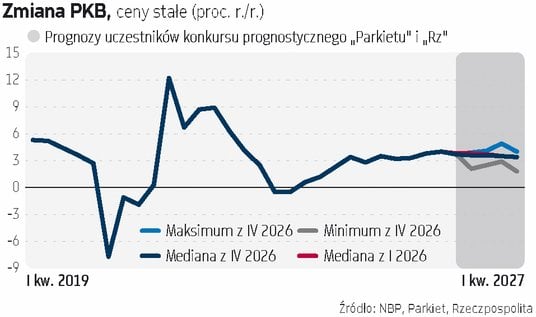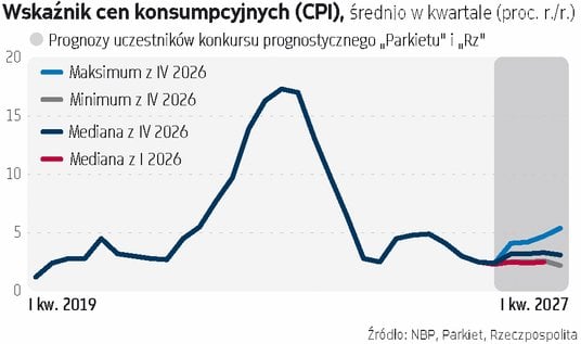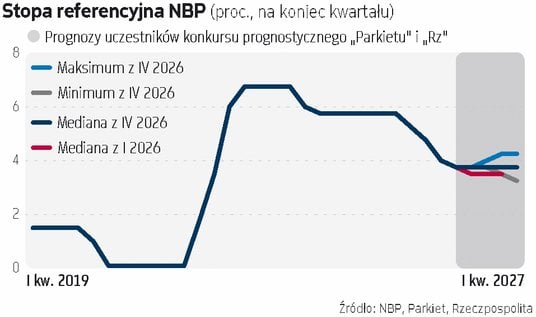 Co jednak warto podkreślić, o ile prognozy obniżek do końca 2026 r. są bardzo nieliczne, o tyle na obniżkę stóp procentowych w I kwartale 2027 r. stawia już aż 14 z 35 uczestników. Wyższych stóp za rok niż dziś spodziewa się zaś tylko troje analityków. Choć więc rynek stóp procentowych (mierzony kontraktami FRA) widzi dziś jedną podwyżkę stóp procentowych w Polsce w horyzoncie najbliższego roku, o tyle wśród ekonomistów to bardzo rzadkie przewidywanie. Bazując na retoryce z RPP, dopiero trwałe wyjście wskaźnika cen ponad ten pułap zapaliło w Radzie czerwone światło. - Gdyby istniało ryzyko, że inflacja wymknie się z przedziału [odchyleń od celu NBP - red.] to wtedy pewnie zareagowalibyśmy – mówi dr Ludwik Kotecki, członek RPP. Z kolei Wiesław Janczyk z RPP wyjaśniał w wypowiedzi dla agencji Bloomberg, że podwyżki byłyby poważnie rozważane, gdyby inflacja utrzymywałaby się powyżej poziomu stopy referencyjnej (czyli 3,75 proc.) przez trzy kolejne miesiące i Rada nie widziałaby argumentów, że to tylko krótkoterminowy wzrost.