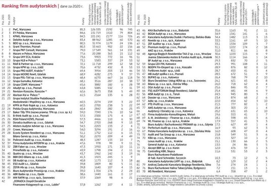 W zeszłym roku ranking wygrało KPMG, jednak w tym roku pałeczkę lidera przejęło PwC. Awansowało z drugiego miejsca. Mimo pandemicznych zawirowań w zeszłym roku PwC dynamicznie rozwijało swój biznes. Zwiększyło przychody i liczbę badanych jednostek.