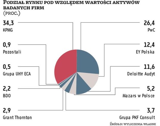 Z kolei jeśli pod uwagę bierzemy wartość aktywów badanych spółek, to na wielką czwórkę przypada 84,7 proc. rynkowego tortu, w tym 34,3 proc. na KPMG.