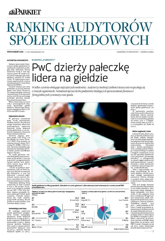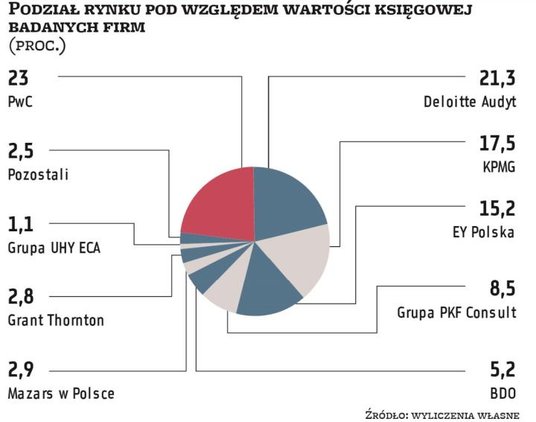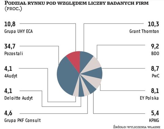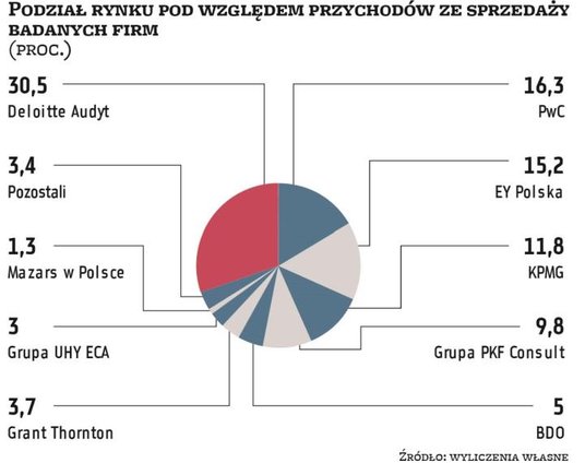 Jeśli pod uwagę bierzemy przychody audytowanych firm, to na wielką czwórkę w ubiegłorocznej edycji rankingu w sumie przypadało 76,6 proc. rynku, w tym najwięcej (26,3 proc.) na Deloitte. W tegorocznym zestawieniu udział wielkiej czwórki spadł rok do roku o 2,8 pkt proc. i wynosi 73,8 proc. Największy odsetek – 30,5 proc. – nadal przypada na Deloitte. Udziały pozostałych reprezentantów wielkiej czwórki są rzędu kilkunastu procent – ostatnim jej reprezentantem w podziale rynku w takim ujęciu jest KPMG z niespełna 12 proc. Warto odnotować, że stosunkowo niewiele od KPMG dzieli piątą firmę na tej liście, czyli PKF Consult. Przypada na nią 9,8 proc. rynku mierzonego przychodami badanych firm.