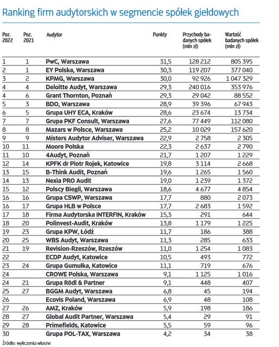 Dane z tegorocznego rankingu potwierdzają, że domeną wielkiej czwórki pozostaje obsługa największych emitentów. Dobrze obrazuje to podział rynku usług audytorskich przy różnych założeniach.