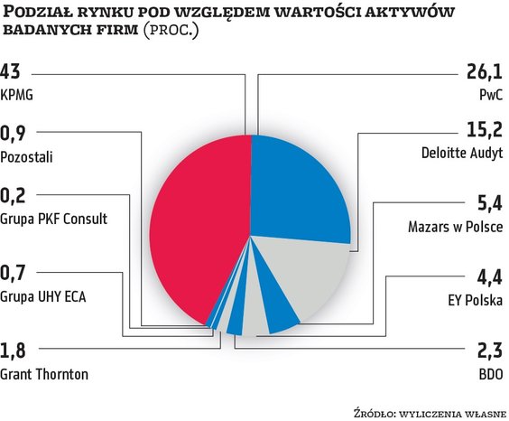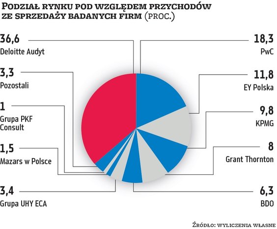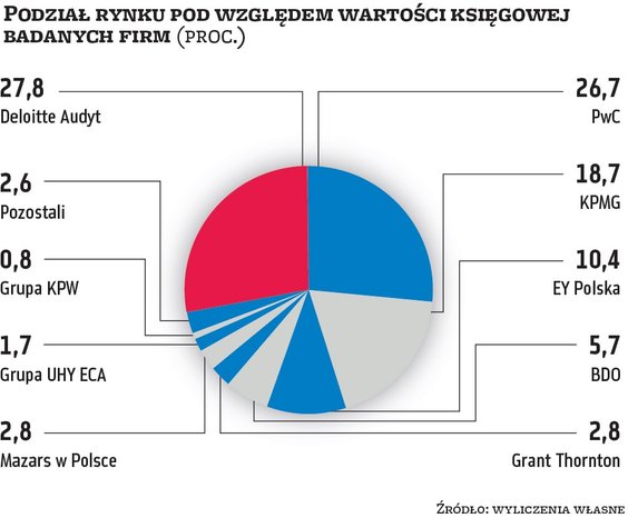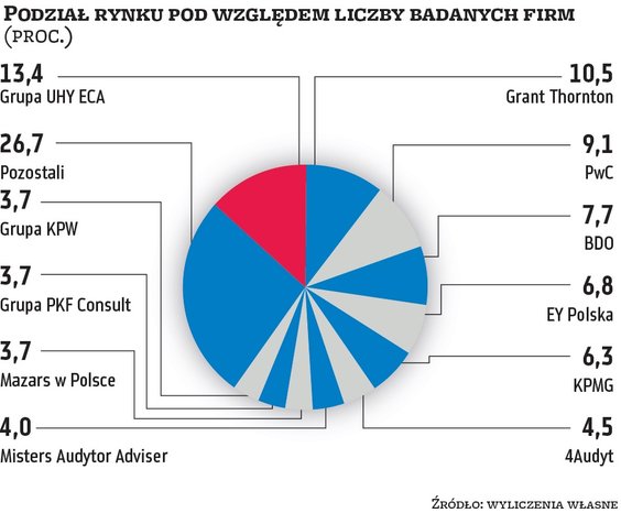 Jeśli policzylibyśmy udziały, bazując na poszczególnych kategoriach, to pod względem przychodów badanych firm zdecydowanie górą jest Deloitte. Przypada na niego niemal 37 proc. rynku. Kilkunastoprocentowy udział mają PwC (18,3 proc.) i EY (11,8 proc.), a za nimi są Grant Thornton, BDO, UHY ECA i Mazars. Na pozostałe firmy audytorskie przypada zaledwie kilka procent tak rozumianego rynku. Podobnie wygląda sytuacja, jeśli przeanalizowalibyśmy udziały pod względem aktywów badanych spółek. Tu z kolei prymusem jest KPMG z 43 proc., za nim plasuje się PwC z ponad 26 proc., a trzeci jest Deloitte z 15,2 proc. Pozostałe firmy mają po maksymalnie kilka procent. Natomiast zupełnie inaczej prezentują się udziały rynkowe pod względem liczby przebadanych firm. W takim ujęciu rynek jest znacznie bardziej zdywersyfikowany. Największe udziały, przekraczające 13 proc., ma UHY ECA. Wiceliderem jest Grant Thornton z 10,5 proc., a trzecia pozycja przypada PwC (9,1 proc.). Pozostałych reprezentantów wielkiej czwórki wyprzedza BDO z niemal 8-proc. udziałem.