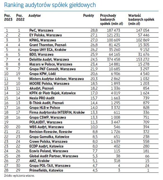 Potencjalnych giełdowych klientów firmom audytorskim nie brakuje: do obsłużenia jest niemal 420 spółek z rynku głównego i prawie 360 z NewConnect. Ich liczba jest podobna, ale wartość rynkowa mocno się różni. Firmy notowane na rynku głównym są obecnie wyceniane na prawie 1,3 bln zł, z czego niemal połowa przypada na firmy krajowe. Natomiast łączna kapitalizacja spółek z NewConnect to niespełna 14 mld zł. W tym segmencie wyraźnie dominują firmy audytorskie spoza wielkiej czwórki. Pierwsze miejsce w zestawieniu najbardziej aktywnych firm na NewConnect przypada firmie 4Audyt. Na podium są też UHY ECA i PKF Consult. Dobrze wypadły też m.in. KPW, B-think Audit i Nexia Pro Audit.