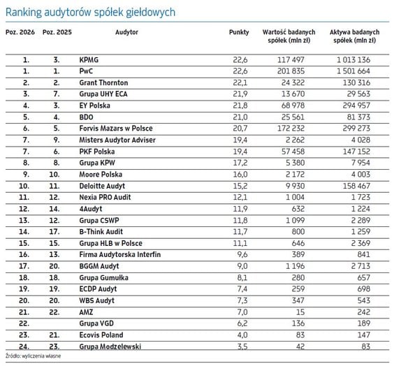 W najnowszej edycji pierwsze miejsce jest podwójne: tyle samo punktów uzyskały KPMG i PwC. Tuż za nimi uplasował się Grant Thornton. Z kolei na trzecim miejscu mamy grupę UHY ECA, która odnotowała imponujący awans z zeszłorocznego siódmego miejsca. W pierwszej dziesiątce znalazły się również: EY (4), BDO (5), ForvisMazars (6), Misters Audytor Adviser (7), PKF Polska (7), grupa KPW (8), Moore Polska (9) i Deloitte Audyt (10).