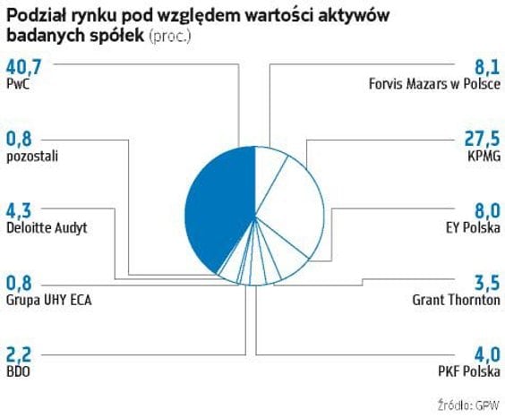 Jeśli policzylibyśmy udziały rynkowe audytorów opierając się na poszczególnych kategoriach, to pod względem aktywów badanych firm pierwsze jest – podobnie jak rok temu – PwC. Na tę firmę przypada 40,7 proc. rynku. Drugie jest KPMG z 27,5 proc., a trzeci Forvis Mazars z ponad 8 procentowym udziałem.
