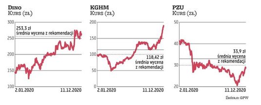 Również wspomniane już Dino ma za sobą imponujący rajd notowań. Od stycznia jego akcje podrożały o ponad trzy czwarte. Jednak tu wyceny analityków są bardziej zróżnicowane niż w przypadku KGHM. I tak na przykład Noble Securities w grudniowym raporcie wprawdzie podniósł cenę docelową dla akcji handlowej spółki, ale podtrzymał rekomendację „sprzedaj". Natomiast analitycy Ipopemy podnieśli zalecenie do „kupuj", a wartość godziwą akcji Dino wyznaczyli na poziomie przeważającym obecny kurs rynkowy. Jeśli do tego zestawu dodamy też raport DM BOŚ, to otrzymamy średnią cenę docelową dla Dino na poziomie 253 zł, a więc nieco wyższym od aktualnego rynkowego kursu.