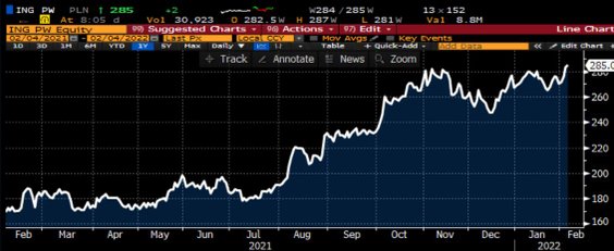 Mimo że na warszawskiej giełdzie obserwujemy dziś spadki, walory ING Bank Śląski przebiły ostatni szczyt i zdrożały do 287 zł, co jest obecnie najwyższym poziomem w historii. Po południu kurs oscyluje wokół 285 zł. Wczoraj bank podał wyniki za ubiegły rok, które były lepsze od prognoz.