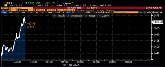 Moskiewski benchmark RTS rośnie o 2,6 proc., co jest najwyższym wynikiem wśród indeksów na Starym Kontynencie. Od dołka wyznaczonego 24 stycznia, notowania RTS wzrosły już o około 15 proc