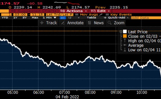 Notowania indeksu WIG20 spadają o około 1,7 proc., schodząc poniżej 2200 pkt