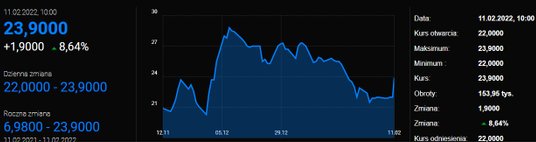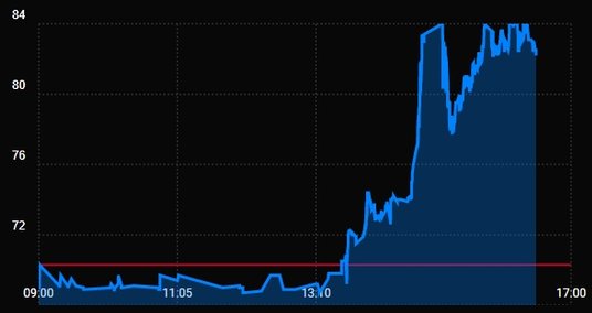Notowania spółki pod koniec piątkowej sesji zwyżkują o około 17 proc., do 82,5 zł przy obrotach przekraczających 4 mln zł.