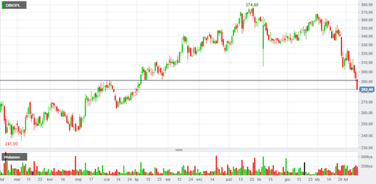 Akcje sieci sklepów są po trzech dniach nieprzerwanych spadków. W piątek walory Dino uległy przecenie o 3,78 proc., co powiększa tegoroczną stratę do 23 proc.