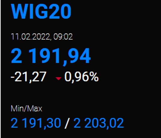 Indeks polskich dużych spółek zaczyna piątkową sesję od około 1-proc. przeceny, do 2192 pkt.