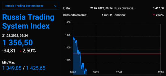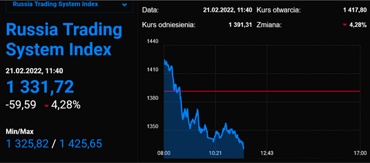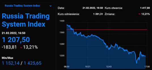 Inwestorzy handlujący na moskiewskiej giełdzie w panice pozbywają się akcji. Główny indeks tamtejszej giełdy RTS traci już ponad 10 proc. Głównym powodem jest oczywiście rosnące ryzyko wybuchu wojny na Ukrainie.