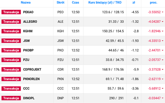 Pozytywne nastroje nie utrzymały się na warszawskiej giełdzie. Główne indeksy nieoczekiwanie zostały zepchnięte pod kreskę. Ciężarem dla WIG20 są zniżkujące walory największych banków: PKO BP i Pekao. Mimo obiecującego startu sesji inwestorzy przystąpili do wyprzedaży ich papierów. Chętnie pozbywają się też akcji Allegro i Lotosu.