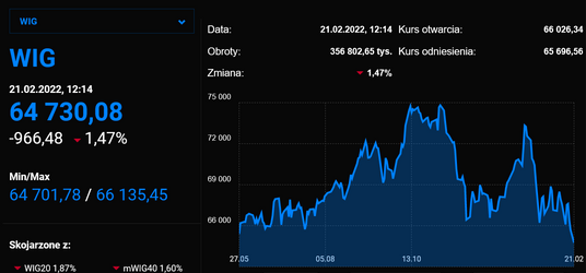 Indeks szerokiego rynku pogłębia korektę schodząc wyraźnie poniżej poziomu 65 tys. Od szczytu wszech czasów z 5 listopada 2021 r. WIG cofnął się już o ponad 10 tys. pkt (spadek o ponad 13 proc.). Tak nisko jak obecnie nie był notowany od maja poprzedniego roku.