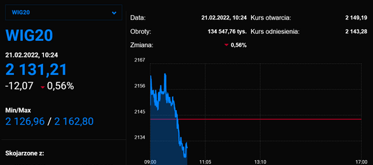 Krajowe indeksy pogłębiają spadki. WIG20 traci już prawie 1,3 proc., będąc coraz bliżej poziomu 2100 pkt. Tym samym indeks największych firm zszedł już poniżej listopadowego dołka. Pod kreska są niemal wszystkie duże spółki. Pozytywnymi wyjątkami są KGHM i PGNiG.
