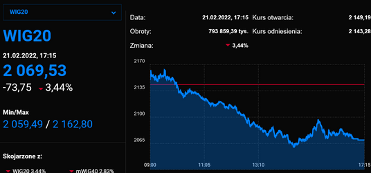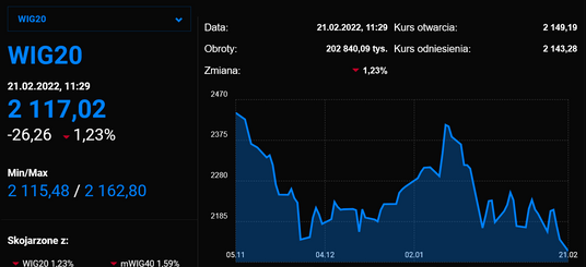 WIG 20 tracił w poniedziałek po południu 2,9 proc., a indeks WIG-Ukraine zniżkował o prawie 5 pro...