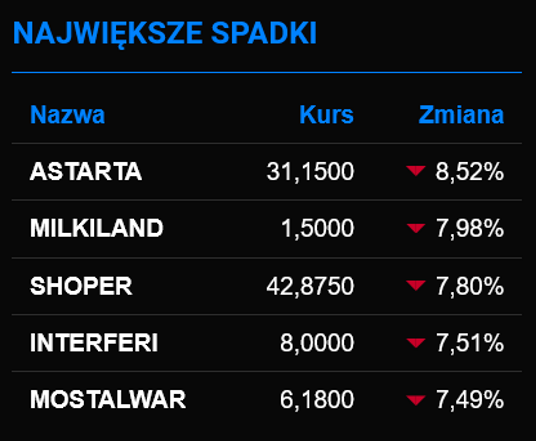 Sprzedający całkowicie zdominowali handel na szerokim rynku akcji, czego dowodem jest przecena zdecydowanej większości małych i średnich spółek. Indeksy mWIG40 i sWIG80 spadają o tracą odpowiednio 3,6 i 3 proc. Wśród „średniaków” przecenie opiera się tylko osamotniona Neuca. Wśród „maluchów” na plusie są Forte, Rafako i VRG.